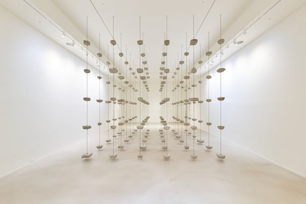 이완, '고유시'(2025). 새하얀 벽면을 가득 채운 560개의 하얀 시계가 저마다 다른 리듬으로 째깍거린다. /포도뮤지엄