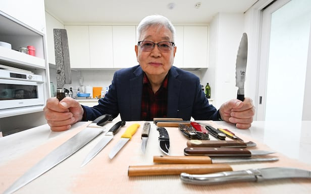 '칼 이야기'를 펴낸 최명 서울대 정치학과 명예교수가 헹켈, 슌, 스위스아미 등 크고 작은 칼들을 한데 모았다. 살림 용도다. 설거지도 '이순신 전법'을 해치운다는 주방이 보인다. / 고운호 기자